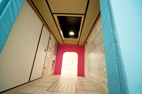 天井にのび太の部屋の畳がある不思議な空間で、劇中の星開拓民の少年ロップルの宇宙船とのび太の部屋がつながるワンシーンを再現。トンネルは子どもが入りやすい小さなスペース。壁にはキャラクターが描かれているので、どんな絵が描かれていたか探してきてもらうのも楽しい遊び方だ。