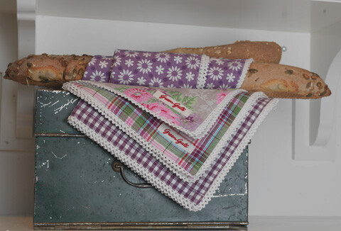 花柄や水玉、レースの縁取りなど、女性なら一度は憧れた柄は、どこか切ないトーンでノスタルジック。もとはモナがパリのアンティーク市で競り落とした19世紀後半のテキスタイルブックから着想。フレンチデザインの黄金期のデザインを、北欧の洗練された完成でリ・デザインしてスタートした。