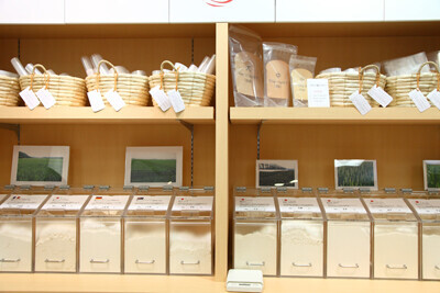 ショップでは、ホームベーカリー向けの扱いやすい小麦粉から、ブーランジェで使用している国産小麦粉、海外のオーガニック小麦粉が少量から購入できる量り売りコーナーまで、ここでしか味わえない希少な「地粉(小麦粉)」も色々取り揃えている。