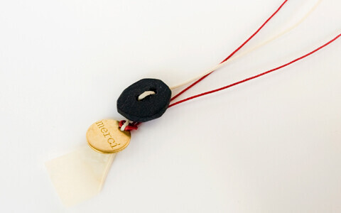 この石は、600 年以上の間、硯の材料として雄勝の産業を支えてきた。この石とパリのセレクトショップ「merci」のジャン= リュック・コロナ氏の協力を得て、赤い糸を通したmerci の小さな金のメダルと和紙のこよりがついた丸く磨いた雄勝石をひとつにまとめ、おしゃれでかわいいアクセサリーが完成した。