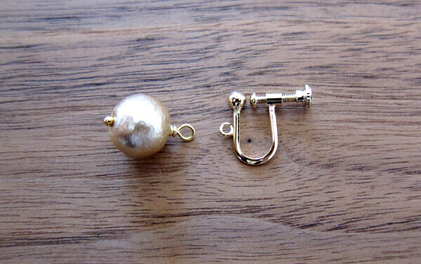 コットンパール2粒、イヤリングの土台(またはピアスのポスト)1セット…以上! たったこれだけ! これらはアクセサリーパーツのお店に行けば合計500円以内で購入可能です。