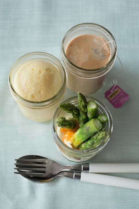 「蒸しパンケーキ」は左中央。右上の「スパイスチャイティー」と右下の「アスパラガスのビスマルク風」もジャースチームで作ったもの(レシピは本に掲載)