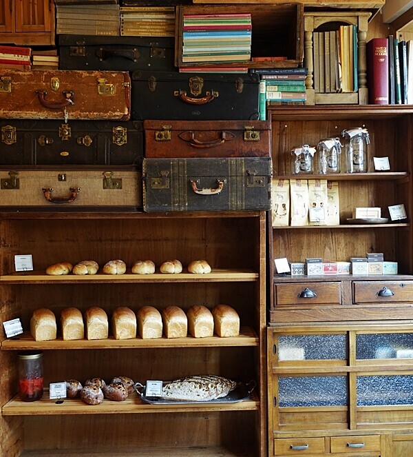 壁には大正時代や昭和の家具が棚として取り付けられ、本棚にはパンドミ、カンパーニュがまるでオブジェのように並んでいます。
