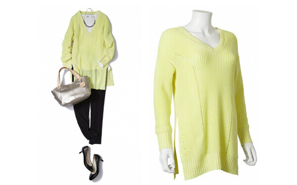 オススメは、長めの丈で裾にスリットデザインが入ったニットです。画像のようなレモンイエローのニットは、顔まわりを華やかな印象にしてくれます。