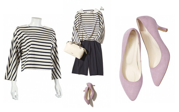 ワイドスリーブボーダートップス(3月上入荷予定) / Mhairi ¥11,880、ネイビーガウチョパンツ / CEIRATE ¥16,200、ラベンダーパンプス / SHOE BAR DEESSE ¥10,778、ミニボストンバッグ(アイボリー) / ROSELY ¥12,960