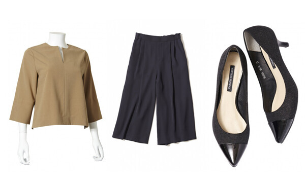 ジョーゼットプルオーバー / GOUT COMMUN ¥12,960、ガウチョパンツ(ネイビー)/ CEIRATE ¥16,200、ラメ×メタリックパンプス / PARADIS COULEUR ¥14,904