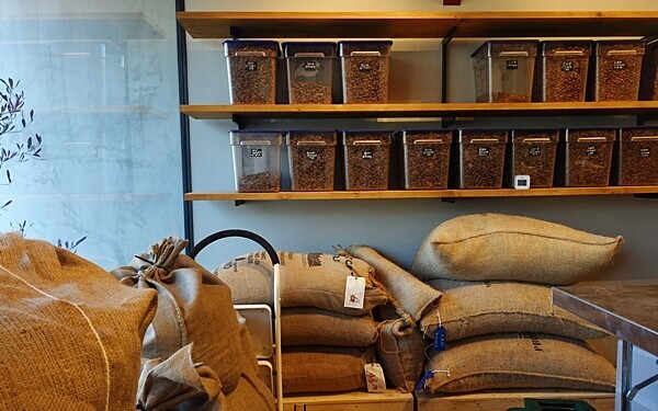 築60年になる倉庫を改装し、全体に木を使用した外観はナチュラル、カカオの形にも見えるブランドロゴが目を引きます。