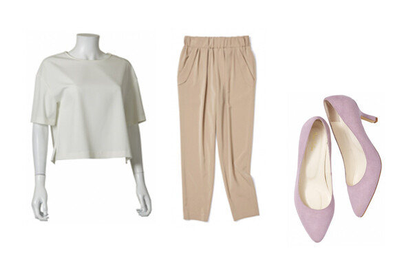 こちらのコーデは「ミルクティコーデ」とも言われるトレンドのカラーリング。アクセントにラベンダーのパンプスを合わせて、フェミニンな印象に仕上げました。