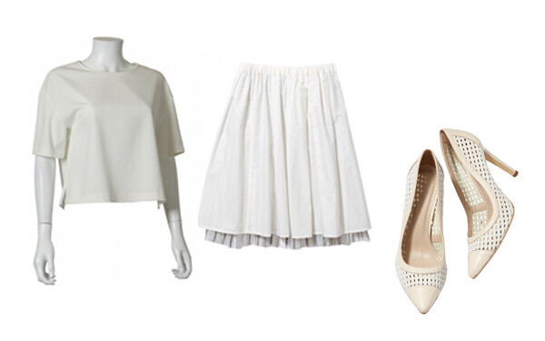 ホワイトサテンプルオーバー / Portcros ¥12,960、リバーシブルストライプチュールスカート / Portcros ¥15,120、メッシュパンプス / DESERT ROSE ¥20,520(参考商品)