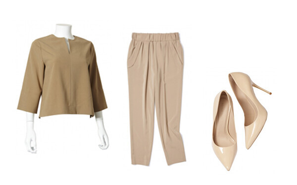 ベージュジョーゼットプルオーバー / GOUT COMMUN ¥12,960、ベージュとろみパンツ / CEIRATE ¥15,120、ポインテッドエナメルパンプス / DESERT ROSE ¥21,384
