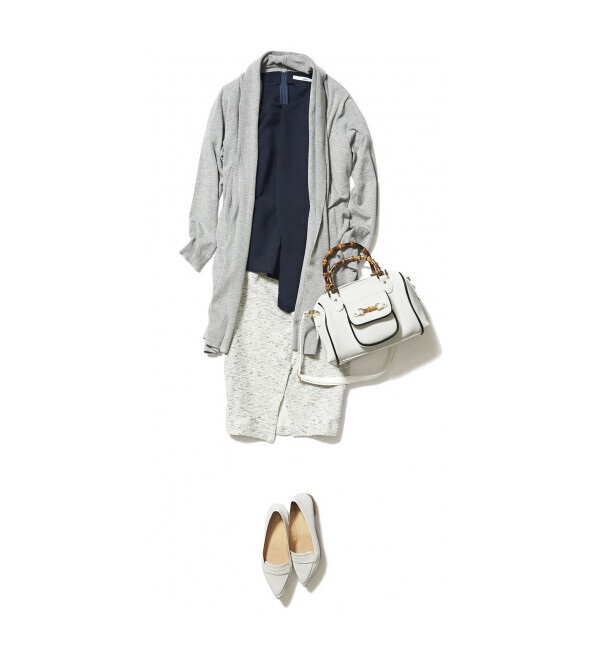 カジュアル素材のスカートに、女性らしいとろみカーディガンを羽織ることで通勤スタイルへシフト。