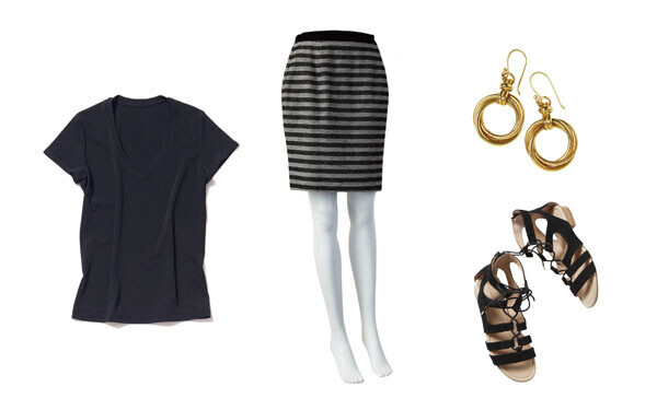 ブラックVネックTシャツ / GOUT COMMUN ¥8,424、ボーダースカート / DONEEYU ¥12,960、リングドロップピアス / gena myint ¥5,724、レースアップサンダル(黒) / チアキ・カタギリ ¥11,880