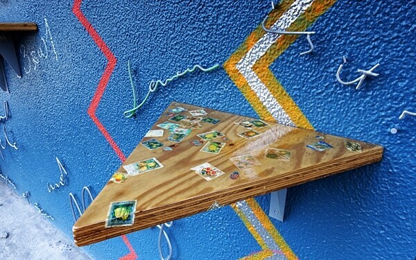 フルーツのモチーフの切手が貼られたポップなスタンドテーブル。