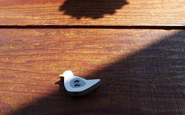 かもめの番号札。店内に流れる透明感溢れるピアノ曲を聞きながら食事ができるのを待ちます。