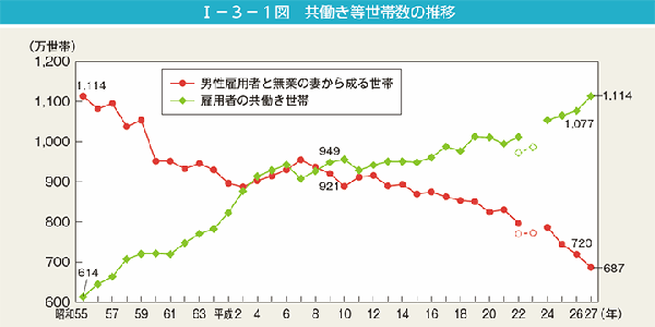 2.「男性雇用者と無業の妻から成る世帯」とは、夫が非農林業雇用者で、妻が非就業者(非労働力人口及び完全失業者)の世帯。