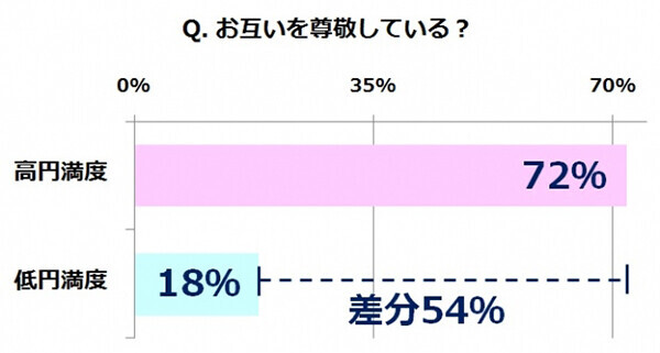「高円満度」「低円満度」を比較すると、「お互いを尊敬している」としているでは、「高円満度」が72%もあるのに対して、「低円満度」では18%。その差分は、なんと54%もあるという結果に。さらに「毎日コミュニケーションを取っている」では、「高円満度」と「低円満度」の差分が48%でした。