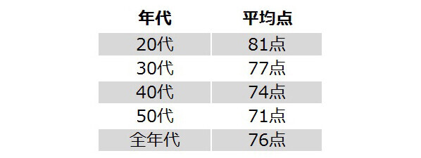 夫婦円満度を100点満点で自己評価すると、「76点」が前年代平均値に。でも20代では81点だった平均点も、50代には71点と少しずつ点数がさがり、一般的に年齢を重ねるにつれ円満度はさがる傾向であることがわかります。