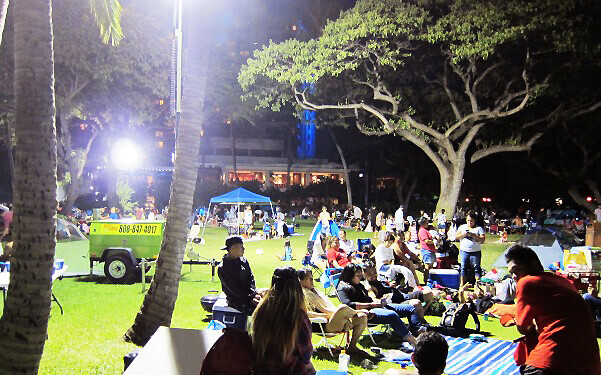 この日は偶然にもアメリカの独立記念日(7/4)。毎年アラモアナビーチパークの「マジックアイランド」で花火大会が開催されると聞き、陽が落ちるころにヒルトン方面へ3人で移動。ビーチ近くの公園では、現地の人々がバーベキューなどをしながら花火を待っていました。