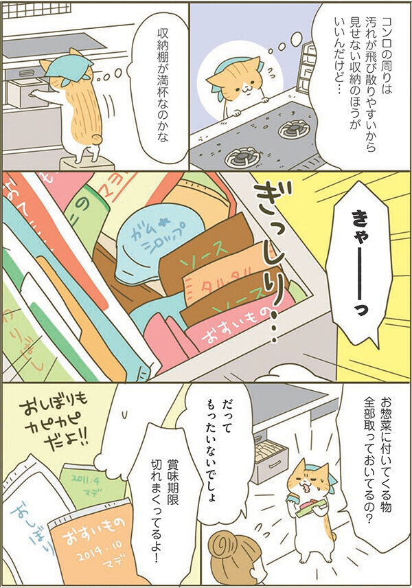 まずはネコちゃんが教えてくれるとおり、一度収納スペースを確認して、期限切れの物を処分するところからスタートしましょう。