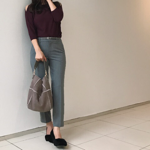 深みのあるボルドーで大人っぽいカラー。肌見せしても落ち着いた色合いを選ぶと、幼く見えずすっきりとした感じに。また重たく見えがちな濃いカラーなので、肩のチラ見せがバランス良く見えます」。