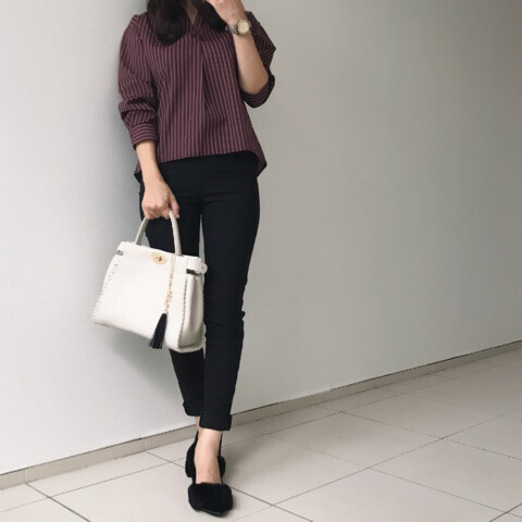 TCバックリングシャツ…¥1500(527-1722)、ストレッチレギンス…¥1500(472-0525)、2wayバッグ…¥2900(今年春購入)、HKファー付きパンプス…¥1900(143-0877)