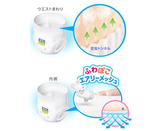 メリーズパンツのお腹まわりのギャザーには「空気トンネル」がついており、汗によるムレを追い出してくれます。また、S・Mサイズは内側の肌に触れる部分が凹凸になっているため、おしりのサラサラ感が続きます。たくさん動くとさらに汗をかくようになるので、ムレをしっかり追い出してくれる機能があるのは嬉しい限りです!