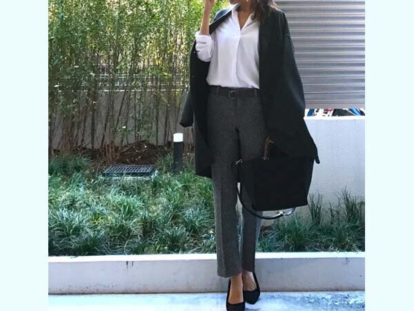 「今日は午後からお仕事へ。少しきちんと見えるコーデでいきました。きちんと見せたいときはとろみブラウスに細身のパンツを合わせることがとても多いです」/身長161cm、ダブルフェイスチェスターコート : ユニクロ(Sサイズ ・ 57 OLIVE)、レーヨンエアリースキッパーカラーブラウス : ユニクロ(Sサイズ ・ 00 WHITE)、ツイードパンツ : ユニクロ(55cm ・08 DARK GRAY)、バッグ : ZAKKABOX、靴 : AmiAmi