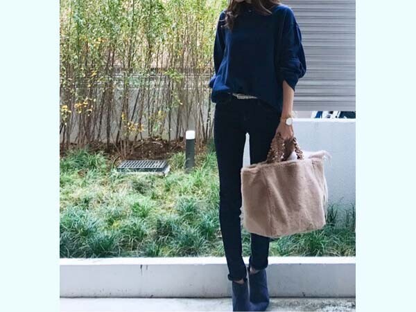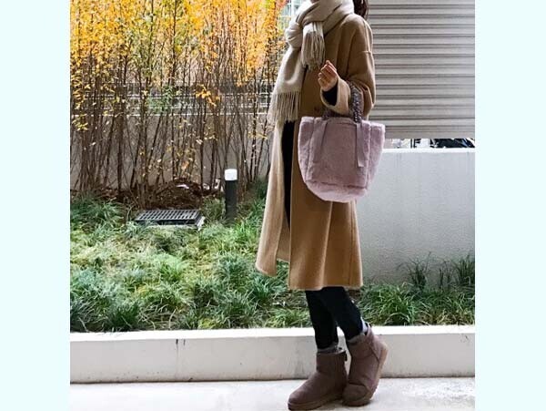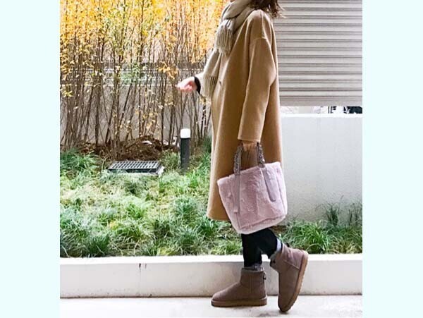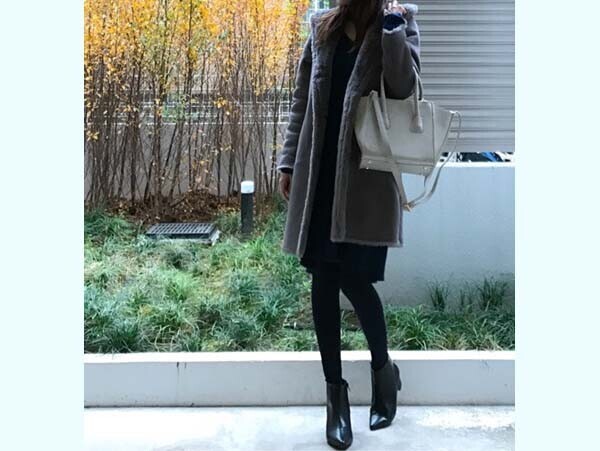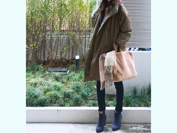 日に日に寒さを感じる今日この頃。そんな日の頼もしい防寒アウターとしてHanaさんが選んだのは、ムートンタッチフーデットコート。「ムートンコートはボリュームが出すぎるのが心配」という人も多そうですが、こちらのコートは縫い目が起き上がらないようジグザグ状にステッチをいれることで、着ぶくれを防止してくれています。それに、ムートンといってもフェイク素材なので見た目よりも軽く、ふわっとはおれるため肩周りの重さも感じにくくなっているようです。