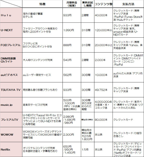 人気の動画配信サービス10社を比較して、各社の特徴を表にまとめてみました。あなたに合うサービスはどこ? 月額料金・無料お試し期間・支払い方法・コンテンツ数といった条件を比べてみましょう。