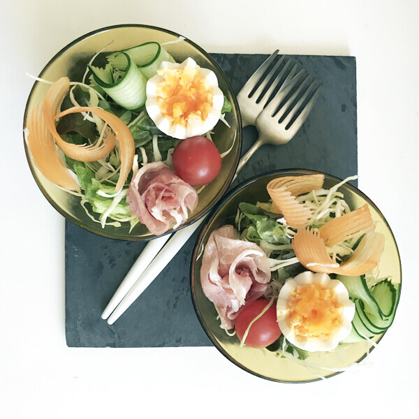 「いつもの飾りっ気のないサラダでも、ウェーブカットにしたニンジンやきゅうりをのせるだけでたちまちおしゃれに見えますね! 簡単なのに見栄えはいいので、おもてなしサラダにもよさそうです」