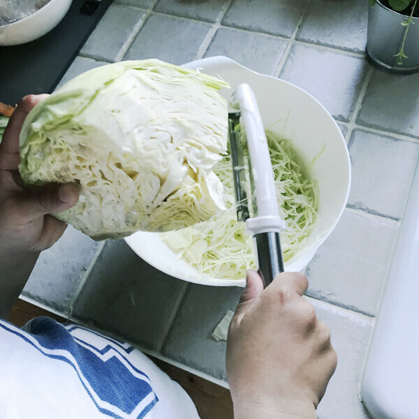 「まずは平刃でキャベツを千切りにしてみました。包丁とまな板でキャベツを千切りにすると、そこら中に飛び散ってしまうのがストレスでしたが(笑)、このピーラーならほとんど飛び散らずにボウルにイン!
