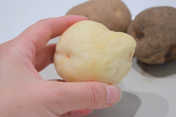 1個あたり、2分ほどで剥き終わり。ということで、正直ピーラーで剥いたほうが早いことは間違いない…が、ピーラーや包丁で剥くのが難しい小ぶりのじゃがいもには絶対便利。