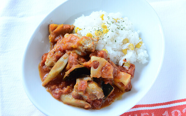 今回のトマト煮は少しとろみをつけているので、ごはんと一緒にお弁当にも入れられますよ。