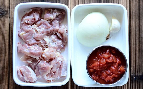 基本の「チキンのトマト煮」の材料は、鶏モモ肉、玉ねぎ、にんにく、トマト缶、オリーブオイルの5つ。