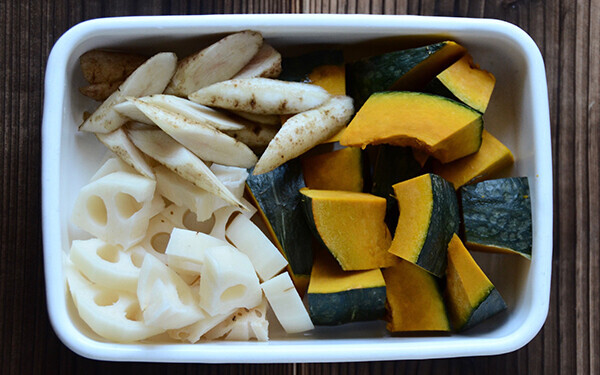 かぼちゃとれんこん、ごぼうを一緒に煮ていきます。