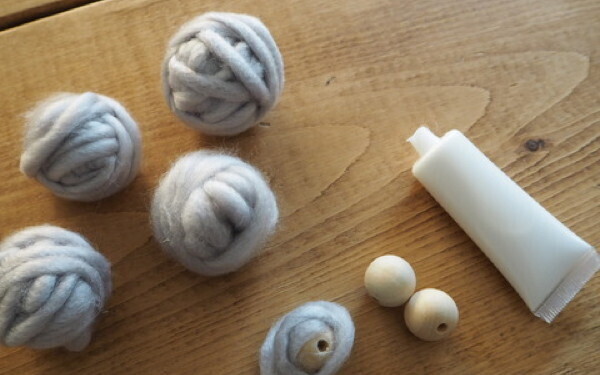 ダイソーのビッグロービングで、コットンボールのオーナメントも作りました。コットンボールといってもウッドビーズに木工用ボンドをつけながらくるくる巻いただけで、簡単に早くできます。