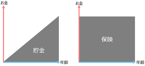 貯金は、時間軸が増えていくにしたがって積み重なっていき、額が増えていきます。一方の保険は、契約した直後から万が一の場合に大きな保障を得ることができる金融商品なのです。