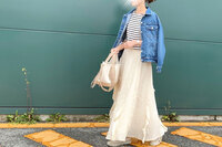 既存のデニムカラーに加え、新しく発売されたホワイトカラーは全身が一気に明るくなり、AYAさん自身も「とっても気に入ってます」とのこと。ストレッチが効いてるうえにバックスリットが入っているので、足さばきも上々! わずらわしさなく、走り回る子どもも追いかけられそうです。