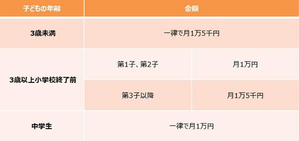 親の所得制限を超えない場合は、次の表のとおり。所得制限を超えた場合は、子どもの年齢に関係なく、月額5千円となります。