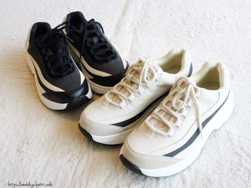 「そして、プチプラのあやさんコラボのダッドスニーカー! 『早く履きたい!』と楽しみにしていました。ブラック×ホワイトのバイカラーで大人っぽく、若見えしがちなトレンドシューズでも、大人女子が履きやすい落ち着いた印象に。