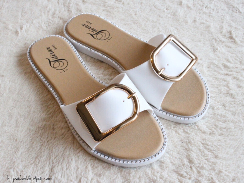 ゴールドのバックルと細やかなスタッズで、足元を華やかに見せてくれるフラットサンダル。楽ちんな履き心地でリラックスコーデにぴったり。色違いでブラックも販売していました!」