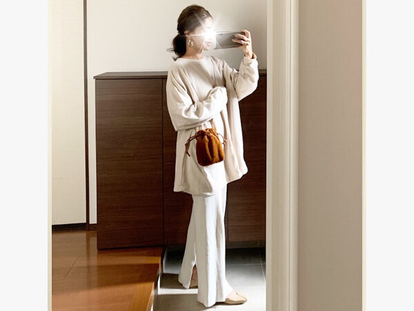 「今日も朝から良いお天気。ご近所コーデです」/トップス : reca、ニットパンツ : meri、フラットシューズ : Pierrot、ミニフェイクファーポシェット : zakkabox