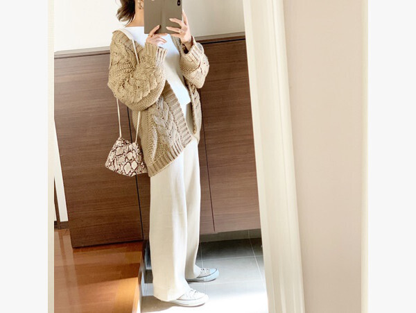 「この秋冬、増えそうなホワイトベージュのゆるっとパンツコーデ」/ニットカーディガン : titivate、ワイドパンツ : HAPTIC、スニーカー : converse、バッグ : donoban