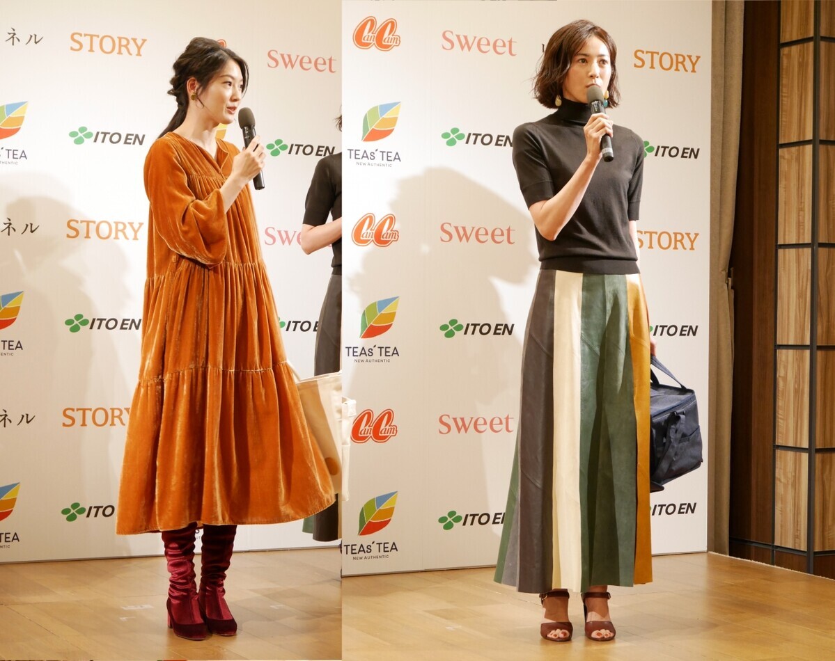 発表会には、4名の人気モデルも登場。実は現在、伊藤園では人気の女性誌「CanCam」「sweet」「リンネル」「STORY」とコラボレーションした「しあわせ運ぶアイテムが絶対もらえる!キャンペーン」を展開中。