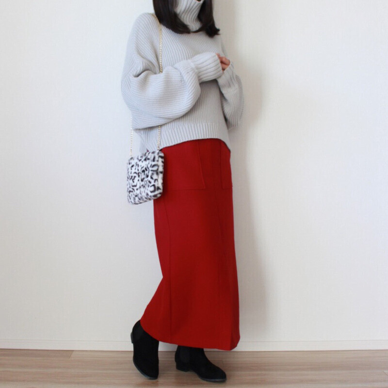 「手持ちにないカラーなことと、季節感のある冬らしさがあってかわいい。Iラインシルエットでストンとした落ち感に、足さばきの良いスリット入りでトレンド感抜群。