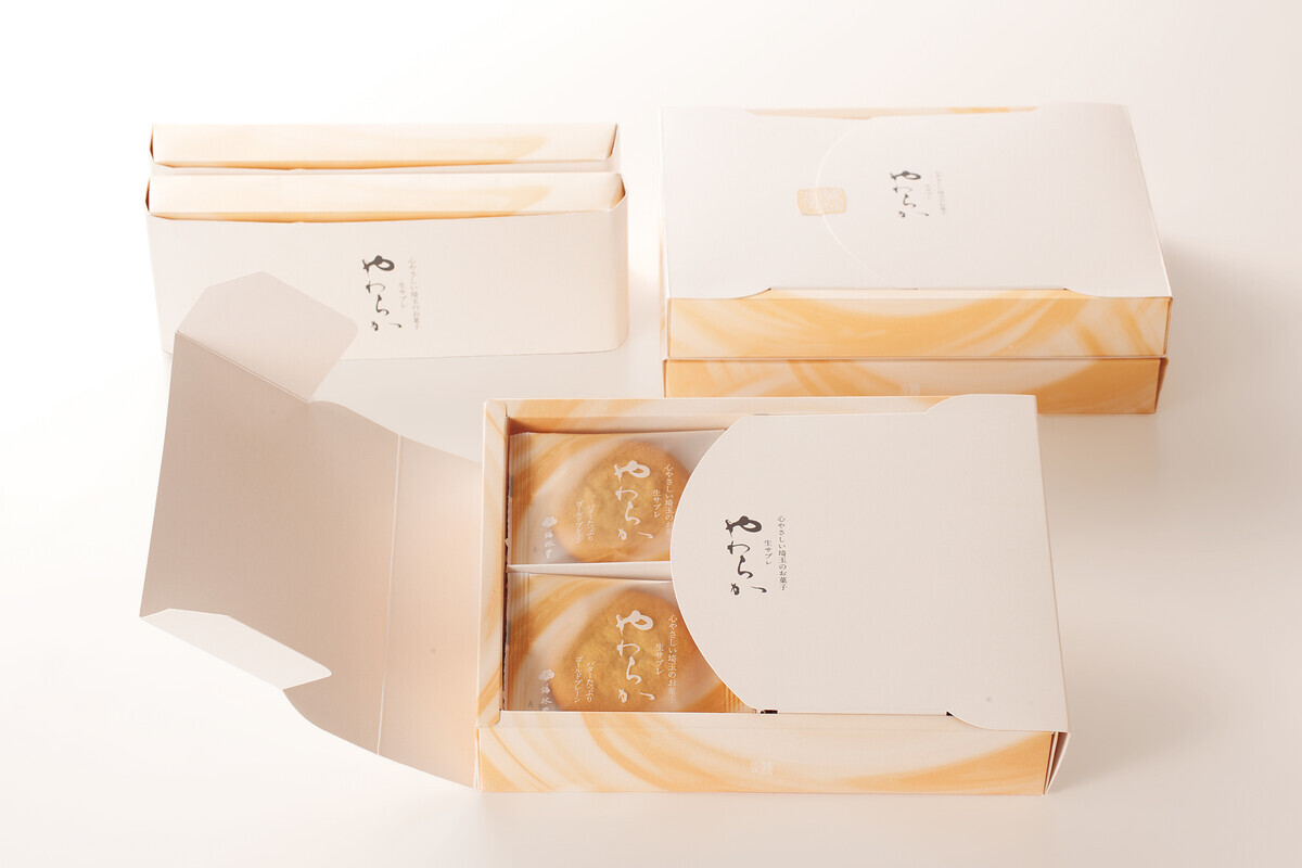 そんな梅林堂の看板商品のひとつが、今年で販売10周年を迎えた【やわらか】。おまんじゅうの発想で、きなこの風味が香る生地にホワイトチョコレートを包み込んだ「生サブレ」で、濃厚ながらも品のある甘さ、すっきりした後味、そして子どもから高齢者の方まで老若男女が楽しめる、しっとりとやわらかな食感が自慢です。