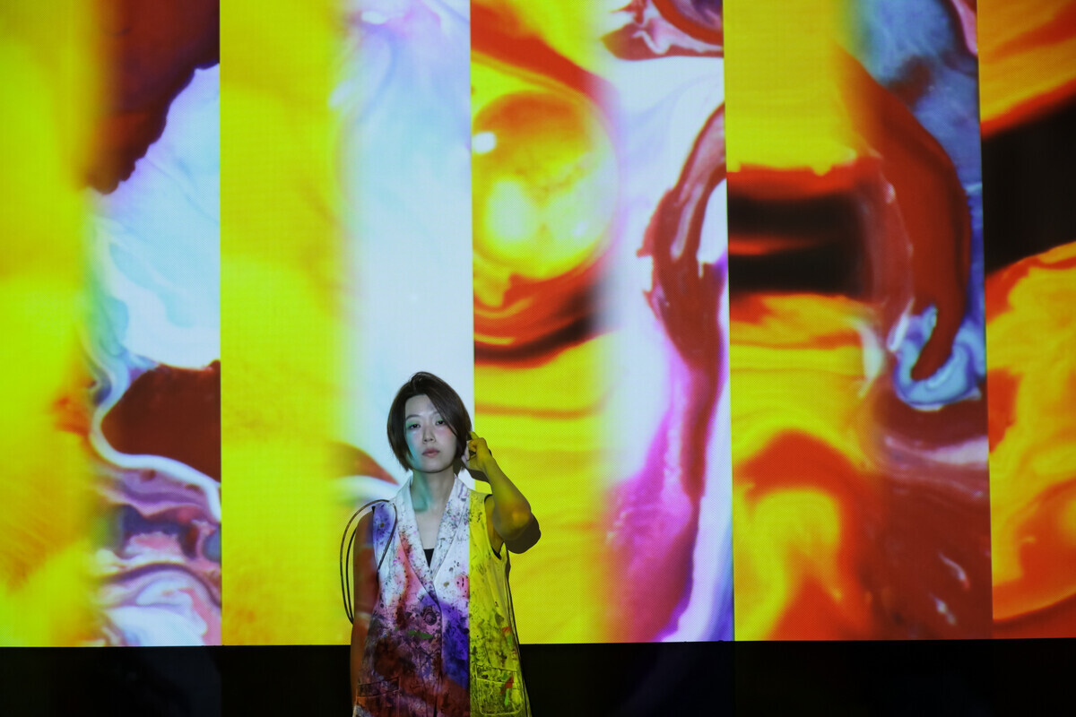 中山晃子|AKIKO NAKAYAMA画家。 液体から固体までさまざまな材料を相互に反応させて絵を描く「Aliv e Painting」というパフォーマンスを行う。科学的、物理的な法則に 基づくあらゆる現象や、現れる色彩を、生物や関係性のメタファーと して作品の中に生き生きと描く。ソロでは音を「透明な絵の具」とし て扱い、絵を描くことによって空間や感情に触れる。