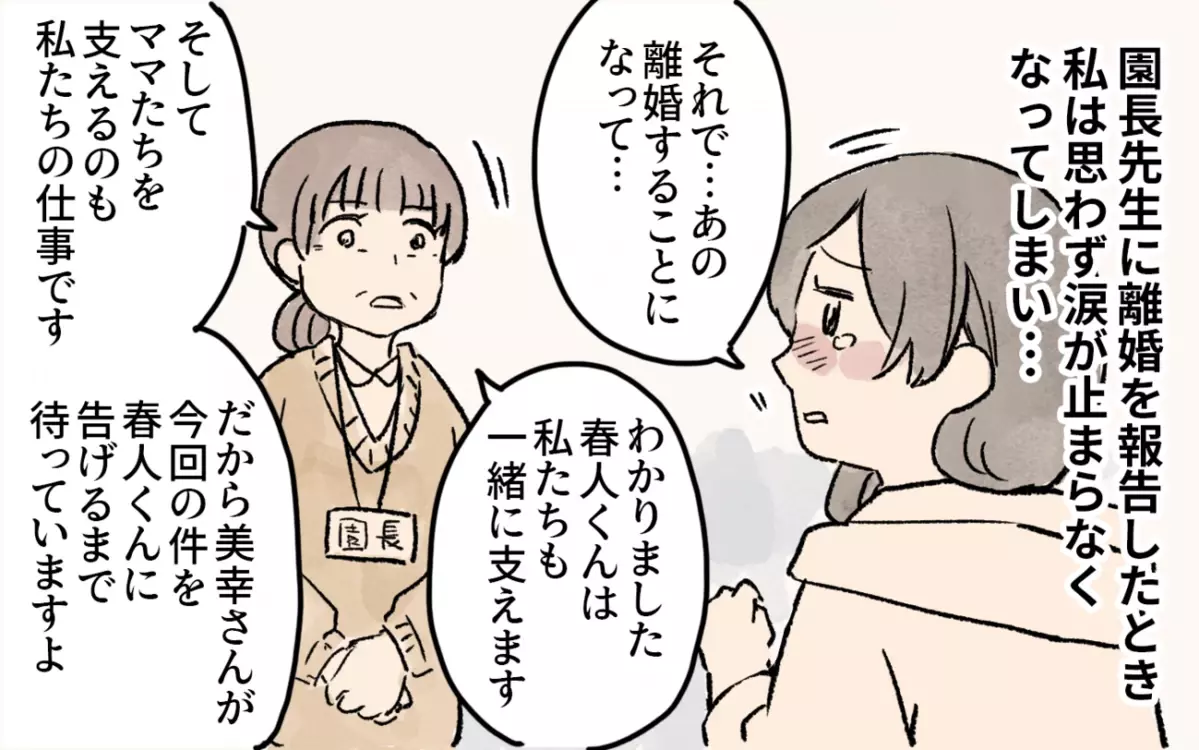 >>1話目を見る幼稚園のママ友とはこれまでとても良い付き合いをしてきました。お互いに愚痴を言ったり、子育ての相談をしたり、助け合ったり。だからこそすぐに離婚したことを言えばよかったのですが、どうしても言い出すことができませんでした。