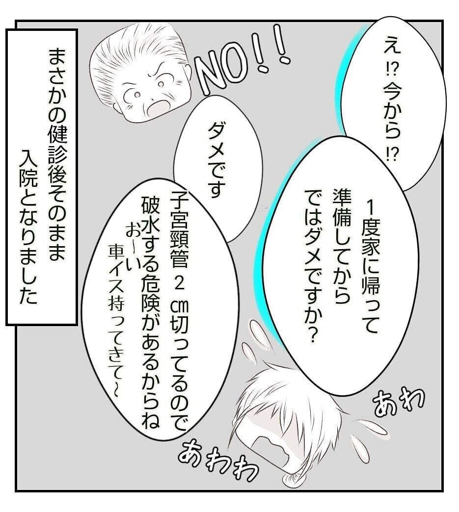 こうして、健診後にそのまま入院となりました。荷物をまとめておいて本当に良かったと思った瞬間でした。