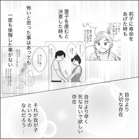 母と再会し、「ママがいなくなっちゃいそうで怖かった」と涙を流す莉子。実はずっと不安で毎日神様にお願いをしていたある日、天から「私が助けてあげる。その代わり妹にして」と声がして、約束をしたようで…。